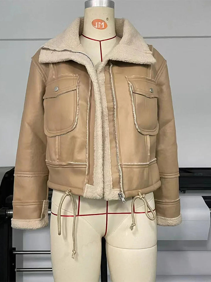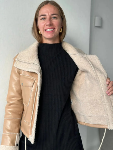 Stay warm and stylish this season with this women's faux leather lambswool jacket, a perfect choice for autumn and winter. Featuring a cozy lambswool lining and a chic short cut, this jacket combines both functionality and fashion. The faux leather exterior offers a sleek, modern look, while the warm inner lining ensures maximum comfort in colder weather. The inspired design with classic pocket details and a zippered front gives this jacket an edgy vibe. Ideal for layering over casual outfits or adding a touch of attitude to your wardrobe, this faux leather lambswool coat is a must-have for the colder months.