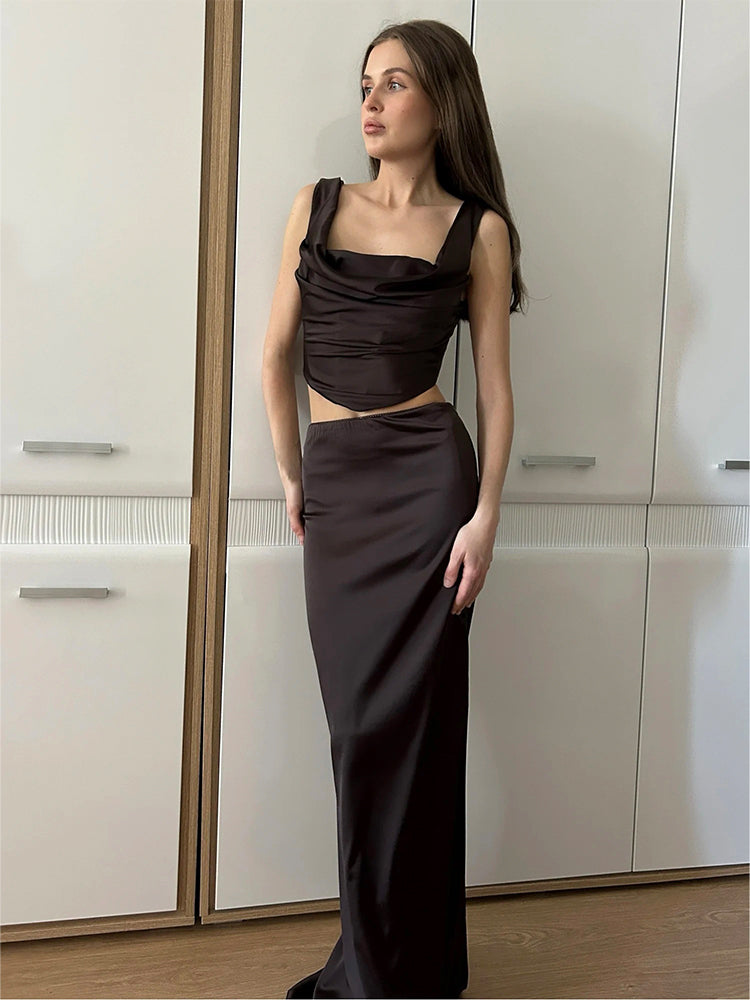 Shine this holiday season with our women's satin two-piece set in a stunning wine red shade. This elegant set features a cropped corset top with a...